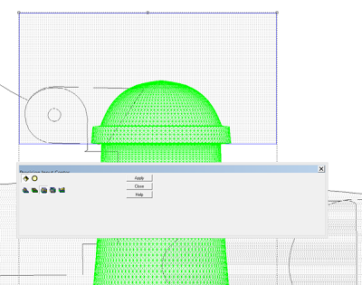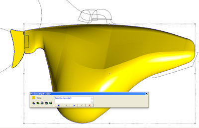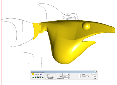 The teeth of the mechanical fish was next. Once more I created a mesh file using the sweep two rails. I then merged it with a zero height relief. This was tweaked to fit, positioned and merged highest with the fish body.