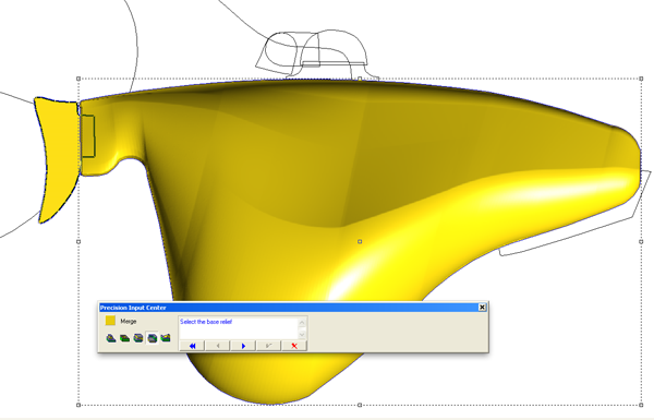 I duplicated the eye and then created a zero height flat relief which I would use to slice half the second dome off with using the MERGE lowest command. I then distorted the half circle by merely stretching it out. I positioned it behind the round eyeball and merged highest with the two separate pieces and the body of the fish.