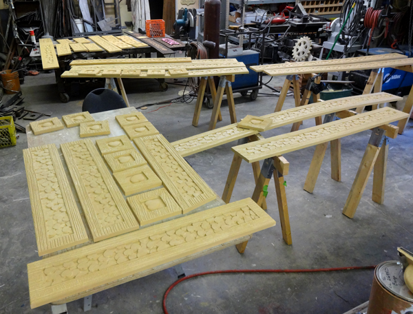 The trim for the new house is fancy without a doubt but with only slight modifications (mostly length of pieces) I was able to create files that could be repeated scores of time. EnRoute made short work of that task. By hand painting and glazing each piece we were able to introduce the randomness I was seeking. Even after many weeks of routing, painting and glazing the shop is still littered with routed pieces of trim from one end to the other. On the router more is in production with one more 4’x8′ sheet of trim pieces yet to come. All are routed from 30 lb Precision Board , except those around high traffic doors which were made from 40 lb board for extra durability.But after all these months of work the end is now in sight at last. Here Kendra holds one of the joining blocks in place