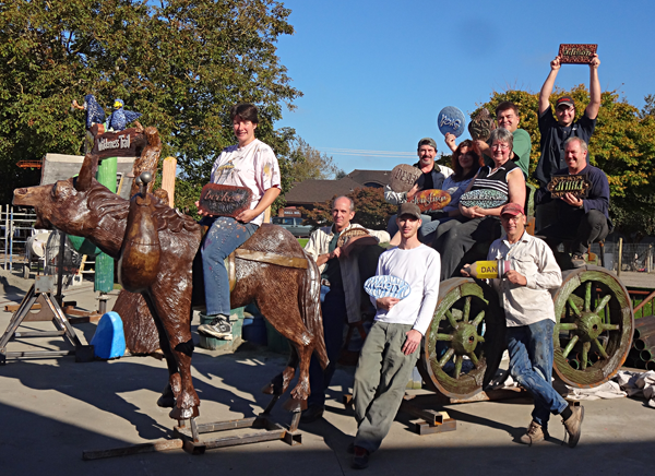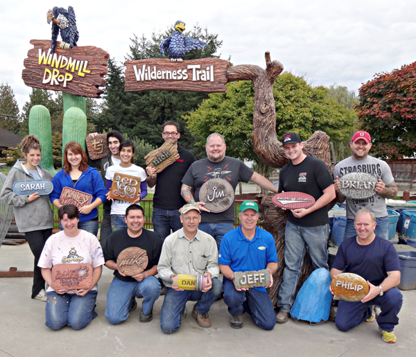 I arrived home late Sunday after eighteen hours of travel. Monday morning we went into full gear on the Cultus Lake project , continuing through Thursday when we switched to workshop mode. The Sign Magic Workshop gathered some very eager students who soaked up everything they could in the next three days. Jim’s smile (below) as he showed off his ‘bug’ piece summed up the feelings of everyone who attended.