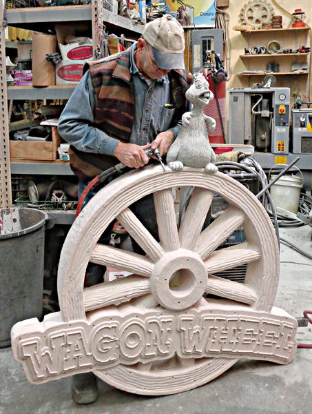 With a large crew both in the shop and up at the worksite much of my days are spent organizing and helping crew. In between I spend a few minutes at a time doing the projects I need to do. It took me two days to complete the hand carving of the woodgrain on the wagon wheel sign. I used an air powered die grinder to remove the excess glue, get rid of the uneven edges and carve in the heavy woodgrain. The work was all done freehand of course, an ideal method to create the weathered and worn look I was going for. The router is great for the precision needed to carve the shape and lettering. The totally random woodgrain carving is quick to carve by hand, much faster than to design and program each wheel piece on the computer.