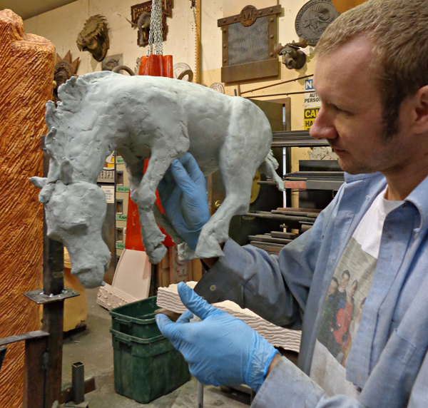 Peter got the jump on the sculpting today as he fashioned the bucking bronco for on top of the sign. He is talented and also has worked very hard to hone his autistic skills. In only a few hours the horse was coming along nicely.