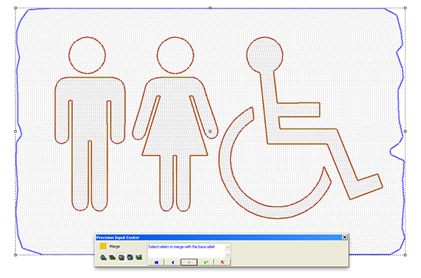 The symbols were made into separate reliefs that were higher than the background. The original relief was 0.6″ tall plus the woodgrain which raised it 0.15″ for a total of .75″/ The symbol vectors were 0.9″ high or 0.15 higher than the background (at it’s highest point)