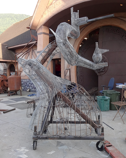 As we got into the realities of the fabrication I also knew some things had to be changed up a little. Because all the pieces have to fit inside shipping containers (fourteen in all) we are limited to about 7′ 6″ tall. This meant I would reshape the tree a little and then perch the parrot a little lower. I didn’t redraw the design but rather did it on the fly as we built the frame and armature. In the picture below the frame is welded and the lath is almost in place. The parrot form can be seen perched on a branch to the middle right.