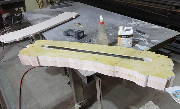 Before assembling the sign I first needed to weld up a steel frame to laminate inside. I cut the pieces of steel, dropped the long tubing into the slot in the middle action of sign and then used two spacers to hold the back of the sign off the table.The two pieces of tubing that were to protrude out of the sign for mounting were ten welded to the interior piece, The spacers allowed me just enough room to do some tack welds of the tubing. One the tack welds had cure for a minute I took things apart to weld them up solid