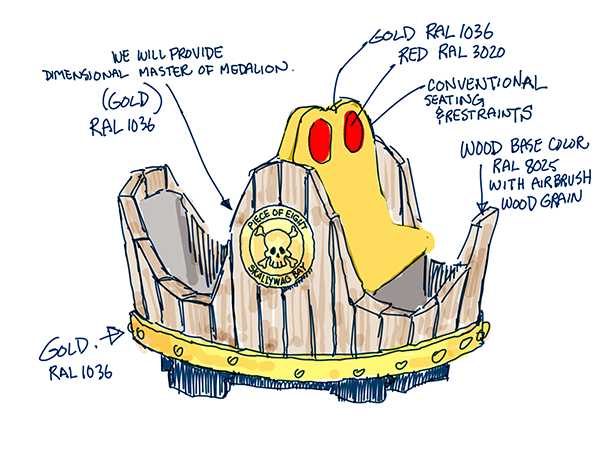 Today’s task was to design the gold medallion that will be mounted to the side of each car on the spinning coaster which is name Pieces of Eight. It features the pirate emblem we are using extensively through the park. The design is simple and is to be routed as a simple cutout – with a cool texture of course. We’ll route it from 30 lb Precision Board. After it is routed we’ll do a little hand sculpting on the skull to make it even more 3D.