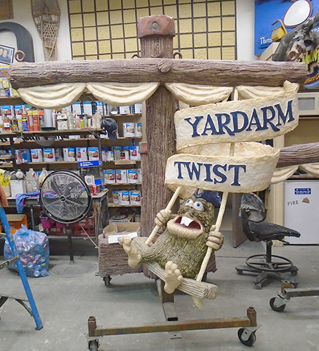 The next sign doesn’t have any routed parts but features another of the gang of Gruffles. Like the other signs it will hang on a mast. The sign is for a ride called the Yardarm Twist. I welded up the armature and then tied on the lath. I used sculpting epoxy to create the character and the scroll.