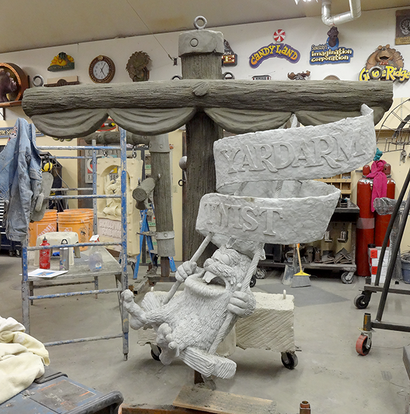 It took a couple of days to finish the sculpting on the character and scroll. The lettering was hand done. Once the epoxy sculpting was done the mast and sail were sculpted from concrete. This is as far as we got before Peter and I left for our trip. The crew did the painting in our absence.