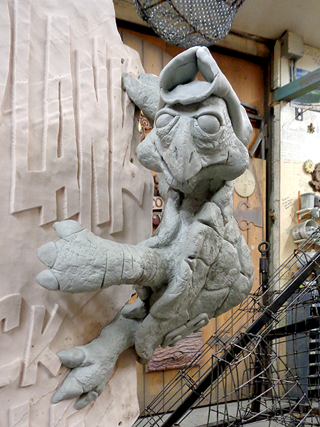 The sign routed up beautifully. I welded up a frame and then laminated it inside. While the glue was setting I cut a turtle shape from some Precision Board and then did a quick sculpt of the shell. This was allowed to harden. A half inch step rod poked out of the bottom center as well as 1/4″ rods for each leg. These would add strength to the sculpt and also serve to be the mounting points for the sign.