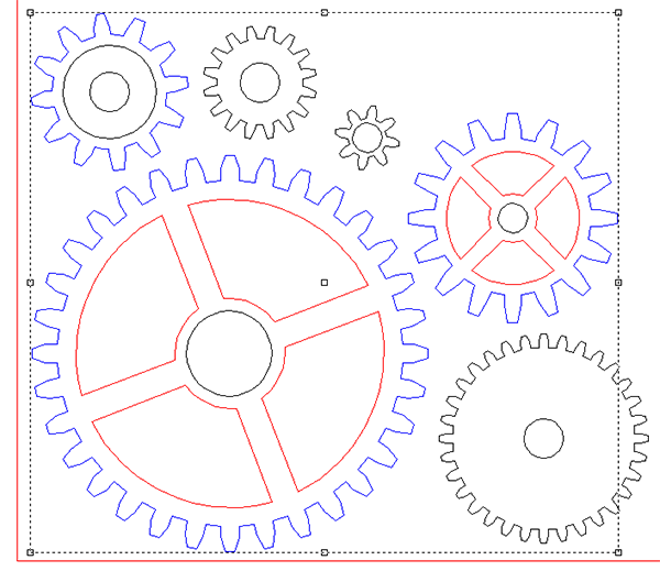 I find EnRoute is the easiest tool to use to finalize shapes and work out the radii of the intersecting corners. Once I had things pretty much worked out I separated the pieces like the gears which would be routed as separate pieces.