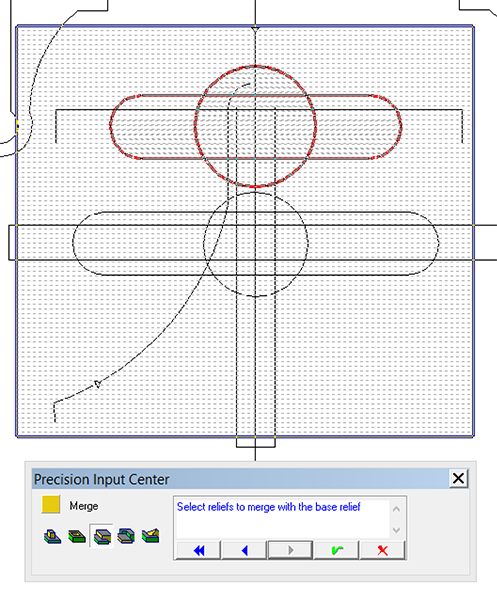 A square zero height relief was quickly created. Then I selected this relief and the mesh to activate the combine tool. The other oddly shaped zero height relief was also created at the same time. I would use this relief (merge lowest) to clip the ends of the hot dog shaped relief to a square shape.