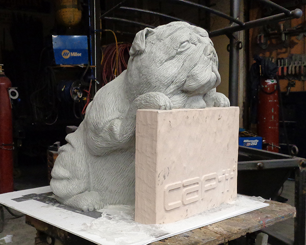 Now they are launching a new advertising campaign featuring a British bulldog mascot. And so I got the call for a new display. This time we are only fabricating the top portion of the display. The beauty of EnRoute and our MultiCam is that I didn’t have to build a new file for the sign portion of the display. I simply searched back through my archives and dug up the old one. It had to be resized slightly and then it was ready to go. Once routed it was a simple matter to sculpt the bulky dog behind it. That process took less than a day using Abracadabra Sculpt and my trust helper Sarah mixing for me.