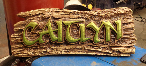 Caitlyn’s plaque received three coats of light tan, followed by a medium brown glaze and finally a glaze we call ‘Sawatzky brown.’ It is a custom brown which has a little purple in it. The lettering is a two color blend of a lime and apple trees – both Modern Masters metallic acrylic paints.