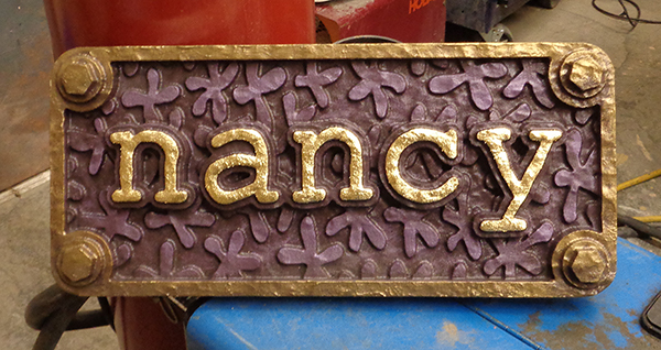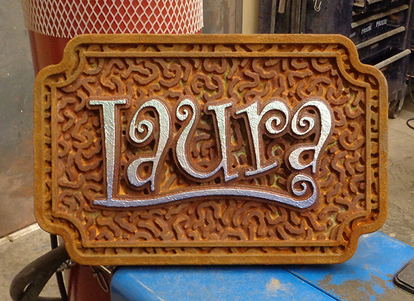 Laura’s name plaque received two coats of reactive metallic iron paint before it got a shot of acid to make it rust. Becke applies a second coat of the mild acid to get the green patina on the background where it puddled. She then clear coated the letter outline as well as the letters. This darkened that area slightly to make the lettering stand out a little more. It also sealed the area making sure the rust paint didn’t bleed through to the lettering top coat. The lettering was painted with a custom blended coat of metallic silver( with a little green blended in) down to a light metallic purple.