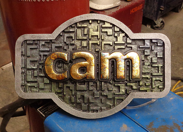 Cam;s plaque was painted with three shades of Modern Masters metallic greens. The outside border received a silver metallic. Becke mixed up two colors of glaze, the first we call ‘swamp’ and the second is a dark brown. The lettering was gilded with a red variegated gold.