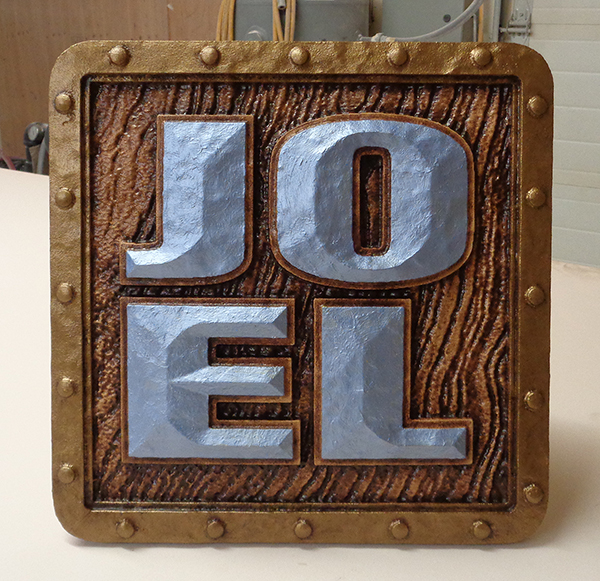 Joel’s plaque started with three coats of tan. Then a medium glaze was applied. Next the outside border received two coats of Modern Masters metallic gold. A ‘Sawatzky brown’ glaze was then applied over the entire name plaque. Then Becke painted the metallic blue on the letters followed by a dry brush blend of a lighter shade to make the prismatic lettering really jump.