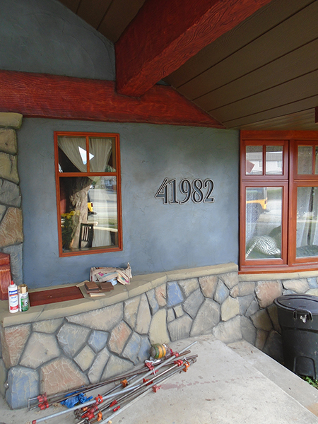 As we were renovating Peter and Hailey’s house they decided they wanted a little different approach to the house number on the outside. The house was built in the 60’s and at the start was very plain and basic. With the addition of the fancy porch, wide overhangs, large timbers and custom hand sculpted rock work it is really becoming a showpiece these days. The number is small in this picture and is partially hidden by Peter.