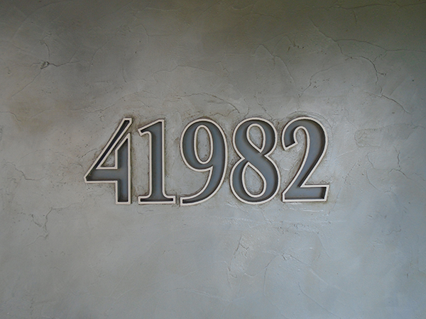 They hand sculpted the rock work along the bottom third of the wall. Above that was a wide band of acrylic stucco which was troweled over a layer of 1″ thick styrofoam. The stucco is about 1/8″ thick in total. Rather than simply cut out the numbers and glue them onto an uneven surface we decided it was better to cut them into a piece of 1.5″ thick Precision Board leaving a 1″ thick background to match the thickness of the styrofoam. We then fastened this to the wall with the recessed surface at the same height as the styrofoam base for the plaster. The acrylic plaster is done in two coats. The first has a layer of fiber glass mesh imbedded into it. This bridges any seams and gaps in the foam, including the join around our number board. Then a thin final smooth coat of acrylic plaster is troweled on. This was then painted as were the letters.