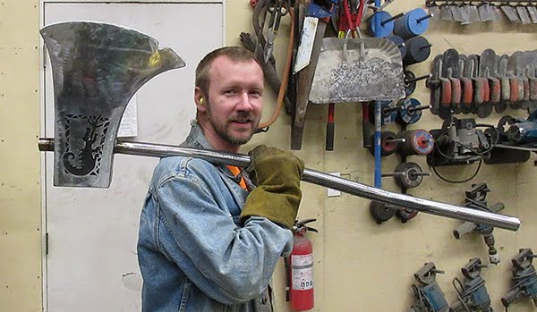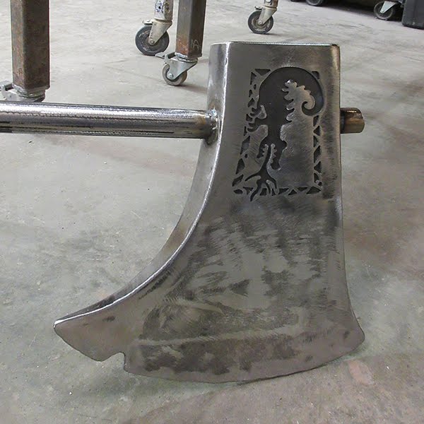 With the plans, models and engineered drawings now behind us it is time at last to begin actual construction. The first bit to get the green light was the dock barrels, boxes and weapons. We decided for maximum reality we would build the axe heads and sword blades in steel. The vector files were created in EnRoute. For a little extra bling Peter whipped up a fancy little dragon which would be incorporated as an etching in the side of one of the axes. The MultiCam CNC plasma cut the parts in a few minutes and then the fun of assembly began. A square patch of metal was welded behind the dragon cutout and then the two faces of the axe were welded to some two inch stock. They were bent together at the blade and welded up. We then cut some steel wedge shaped flat stock to create the top and bottom and back of the axe. A little grinding smoothed everything out nicely. As a final step we welded on some pipe stock for the armature for the handle. We’ll send it out for galvanizing before we sculpt the ‘wooden’ handle.