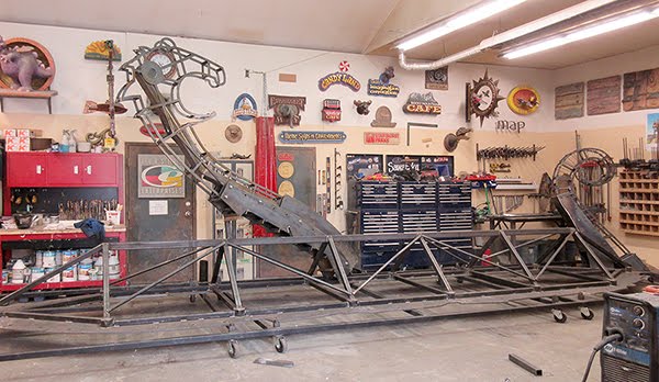 Then it was time at last to begin the fun stuff. We prefabbed the head and tail of the Viking shipwreck and then placed them with the forklift before welding them firmly in place. This thing is pretty massive and will get a lot bigger yet as we add the rockwork and other bits of the ship around these first two elements.