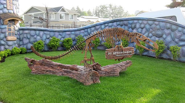 With the return of summer lately we are getting started on finishing a little more landscaping around the yard. A few weeks ago we prepped the ground and rolled out some turf. It sure cleaned things up in a hurry. Once the grass was down we could do a final install on the dinosaur sign. The rust patina has really evened out over the winter months and it is looking pretty fine! I’ll cut in a flower bed around it in a week or two when it is time to plant the annuals. Will it encourage the look-loos to make an appointment before coming on our property? I doubt it but it does finish off the area beside the driveway very nicely.