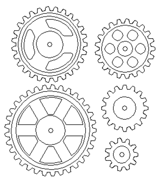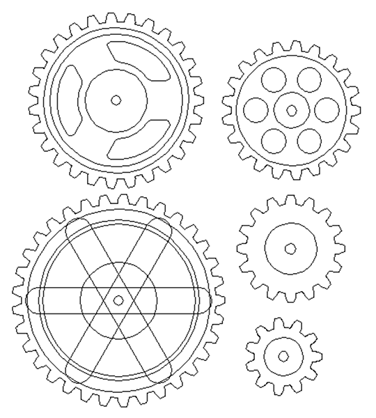 Without changing the scale of the gear rings I created the vectors for five different gears. This is almost all the way through the process. The largest gear is not yet complete. I used the jigsaw tool to create the spokes, then deleted the spokes.