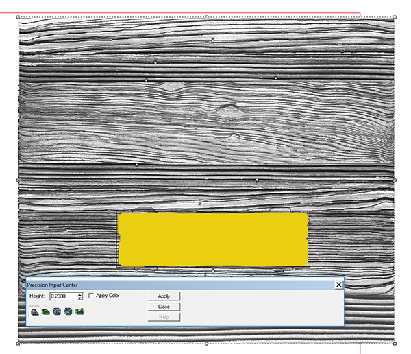 I then imported a sandblasted woodgrain bitmap which I sized to fit on the board. I applied it with a value of 0.2″ tall.