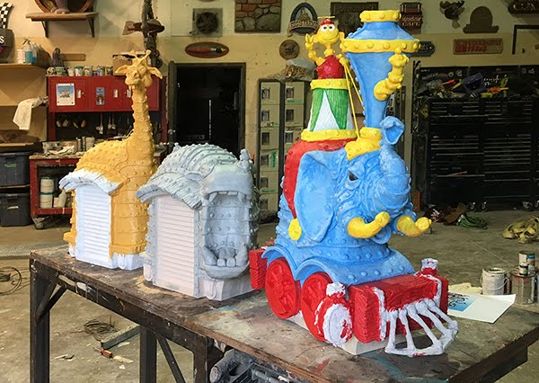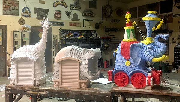 As I finished the models Becke began the painting. She started with the elephant engine. With large detailed models the painting process is painstaking, taking almost as long as a full sized piece. The base colours are layered on, then the glazes. All of it is done with fine artist’s brushes. We still have a couple of day’s work to do before they are done but a circus train never looked better!