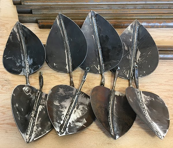 Today I designed the cutting files (in EnRoute) for the steel leaves. I then formed them and welded in half in steel rods for the stems. Once we finish grinding them we will send them off to the powder coaters.
