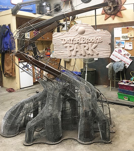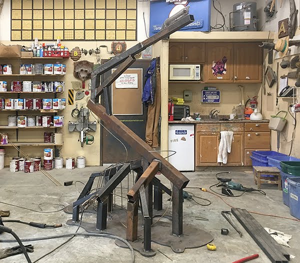 Once the basic structural frame was donee started welding up the pencil rod armature and tying on the galvanized lath. The double sided sign was designed in EnRoute a d routed on our MultiCam from three layers of 30 lb Precision Board. The steel structure is embedded in the centre layer of the sign. Once I had located the sign we can now continue building the top portion of the tree armature.