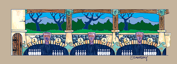 A second drawing which I did a little later worked out more of the details for presentation. A few things changed as we proceeded. The archways had to be flattened out a little to keep things legal for the serious bowlers. We were still working on the colors at this point as well.