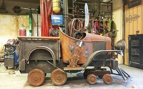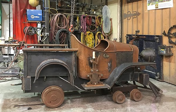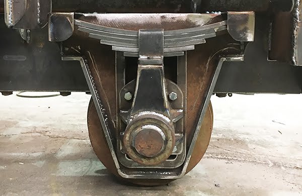 I decided I would add a single spring to the back axle and a arch bar suspension to the front truck. Using some historical pics from the web I designed the steel components in EnRoute. The pieces would be cut from 3/8″ and 1/8″ plate steel. The screen grab below shows the file for one side of the truck. It took a couple of hours to assemble, weld and grind each piece.
