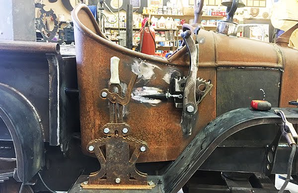 Now that the little trail truck is running and the bulk of the big fabricating is behind us it is time to begin all of the fun small stuff. I’m currently working on the levers which will control the functions of the vehicle. The Johnson bar which is bolted to the running board controls the forward and reverse of the variable speed hydrostatic transmission. To operate it you pull the safety back and then move the lever forward and reverse. The disc brake is controlled by the new lever addition – just above it. To operate the brake you push on the lever. This controls has a safety which will lock the lever in position to act as a parking brake. I still have to fabricate the throttle which will be located just behind the brake.