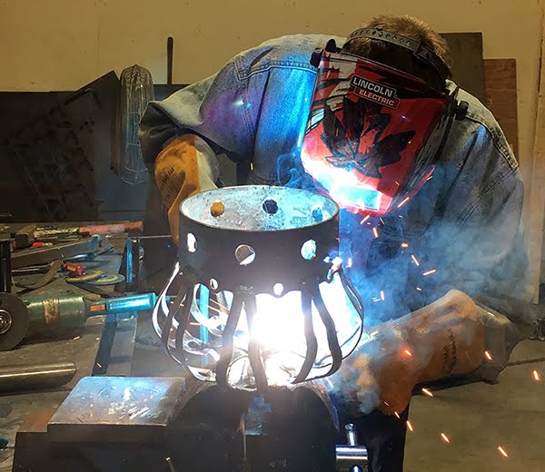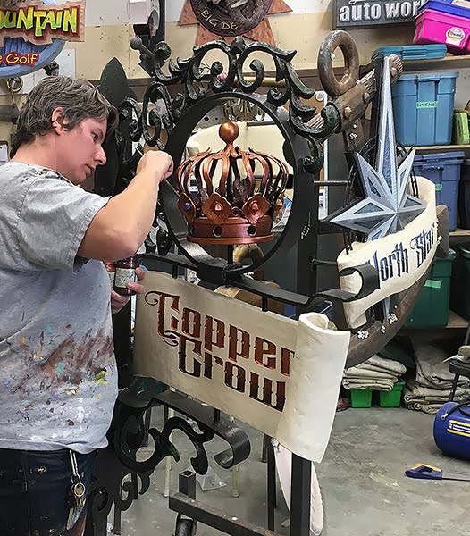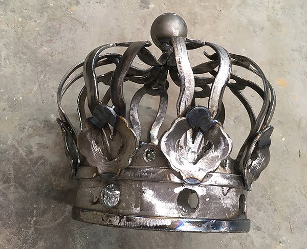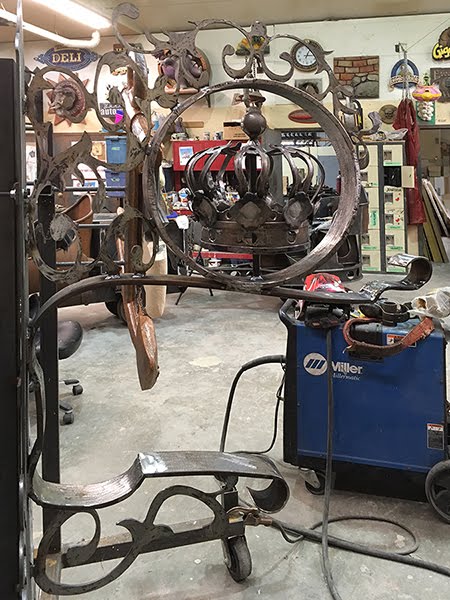 The ring around the crown was cut from a piece of 16″ diameter pipe. The Curved flat bar was hand shaped and formed in pieces. It was then welded together to form one bracket that perfectly matched the shape of the scroll. We then hand sculpted the curls using sculpting epoxy. The plasma cut curlicues were then welded into place