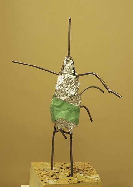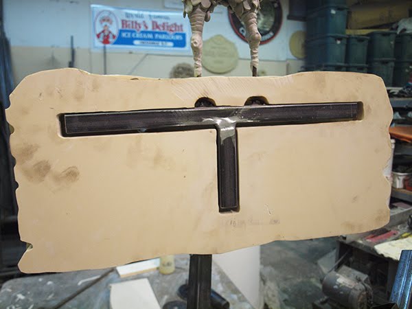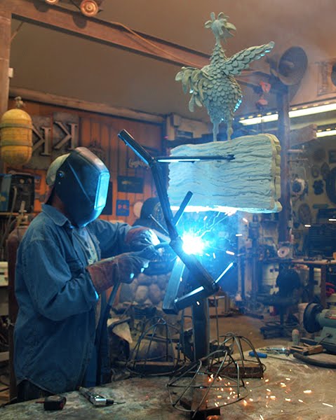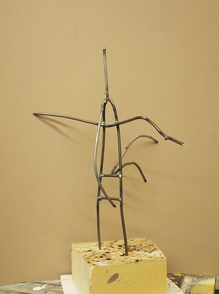 While the machine worked at routing the front and back of the sign I got busy doing the rest of the piece. I roughed out an armature using 1/4″ pencil rod. It’s welded together for extra rigidity.
