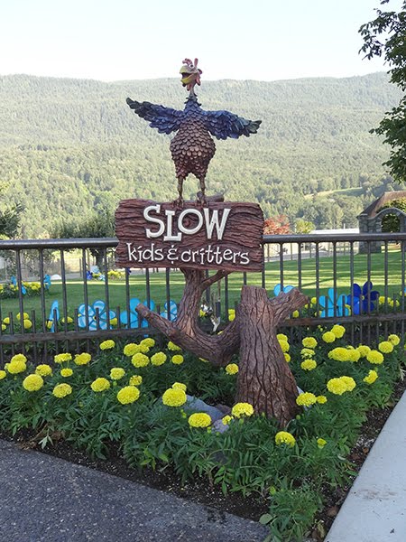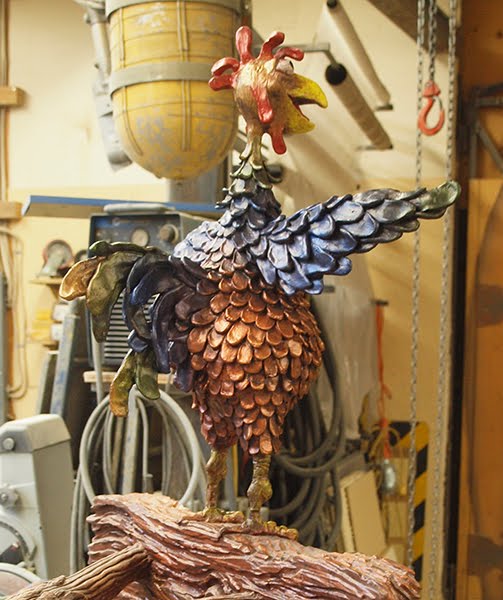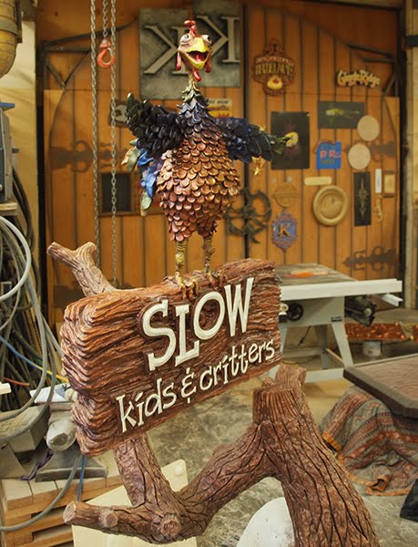 Janis loves chickens but there are no roosters allowed. (they tend to crow early in the morning and wake her up!) I believed we needed a rooster somewhere on the property and so I designed a fun fellow to perch on top of a sign Janis had been asking for in our yard to warn visitors to slow down as they passed through the the shop.