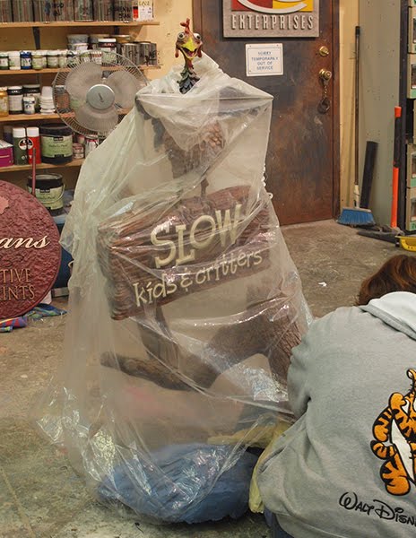 The rocks at the bottom of the tree were done using fibreglass reinforced concrete. The heavy weight of the concrete made the sign more stable. The rocks were hand painted with acrylic house paints and then speckled using an automotive undercoat gun and very low air pressure.