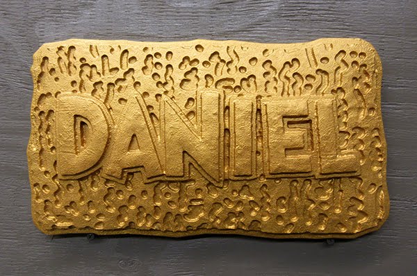 Daniel’s name plaque was first painted with a metallic gold and then the glass were accomplished in two shades of copper. The lettering was back to the gold.