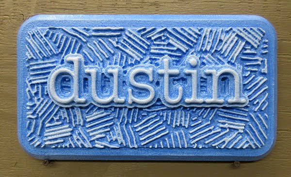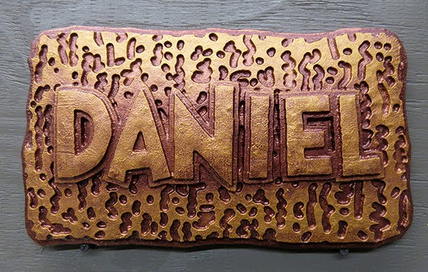 Dustin’s name plaque was done much the same way, one;y with various shades of blue glaze. The lettering was again painted last with two coats of metallic gold.
