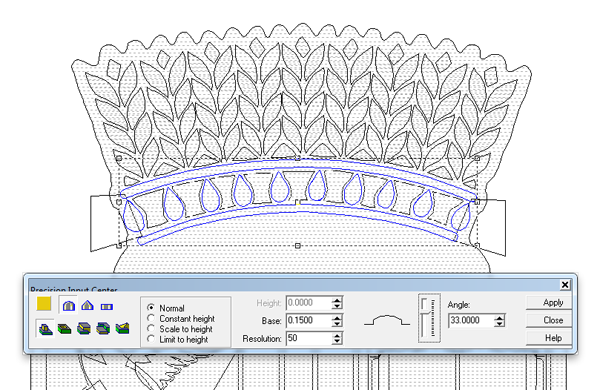 The wheat crown on the top of the crest was the next part of the relief puzzle. It like the rest of the relief would use a variety of tool in the EnRoute bag. The vector was fine as is with the exception of the two drop shaped pieces at each end. I cut and pasted two drops into place and then drew two shapes that cut them in half. This would allow me to trim them to shape in a bit.