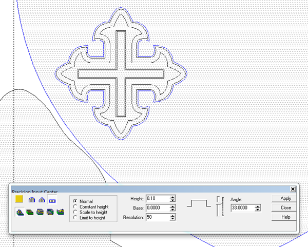 I forgot to grab a screen shot of the next step but I selected the top wheat shapes. I used the prism tool to make the reliefs. The drops and the bars of the crown were next. These elements were domed with a base of 0.15 inches.
