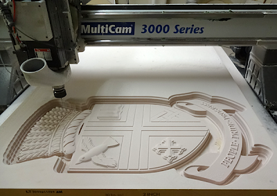 Today I finally had the chance to put a piece of 2″ Precision Board onto the MultiCam and route the city crest file I built last week. The file was routed in two passes – one with a 3/8 ball nose bit and a second pass with a tapered flute 1/8″ ball nose bit. The piece was about 42″ tall in total and 24″ wide.