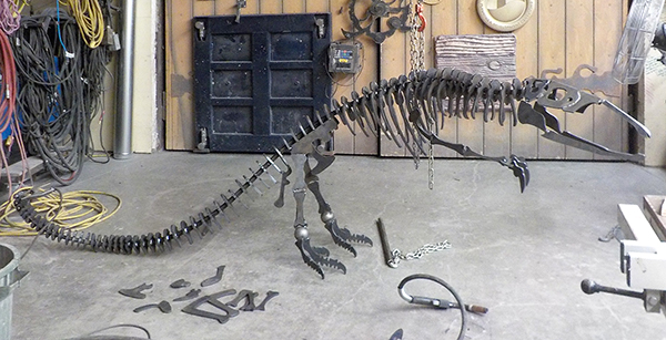 Yesterday, Russel Boudria, the head trainer from MultiCam in Texas arrived to set up our shiny new CNC plasma cutter and train us how to use it. He was eager to get started even though he had spent most of the day in transit. That’s dedication! We worked a couple of hours levelling the table, sorting out wires, hoses and cables, and testing things out. We got to the point where we could move the gantry and test fire the machine. Tomorrow we’ll begin some serious cutting. As I thought about what the first cut pieces might be I knew we would want to set a fairly high bar as the starting point. From here we will get even more creative. I knew just the test piece. Phoebe mentioned that she needs a mailbox for their new house. Ordinary just wouldn”t do. She also happens to love dinosaurs. So I thought a life-size velociraptor skeleton holding a custom built mailbox might be about right. Phoebe agreed. I designed the cutting file after Russel left. This is going to be FUN!